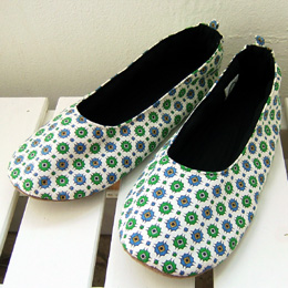 カラフルな色柄がかわいい、hugオリジナルのバレエシューズ型ルームシューズです。底はピッグスウェードを使用。付属で袋がついています。